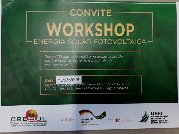 Jaguaruna A Cresol Jaguaruna convida para Workshop com o tema energia fotovoltaica,com o tema o papel do crédito na preservação do meio ambiente,fomento e produção de energia limpa. O evento acontecerá no próximo dia 13 de agosto de 2018 com início as 08:00 da Manhã seguindo até as 18:00 horas ,o evento acontecerá nas dependências […]