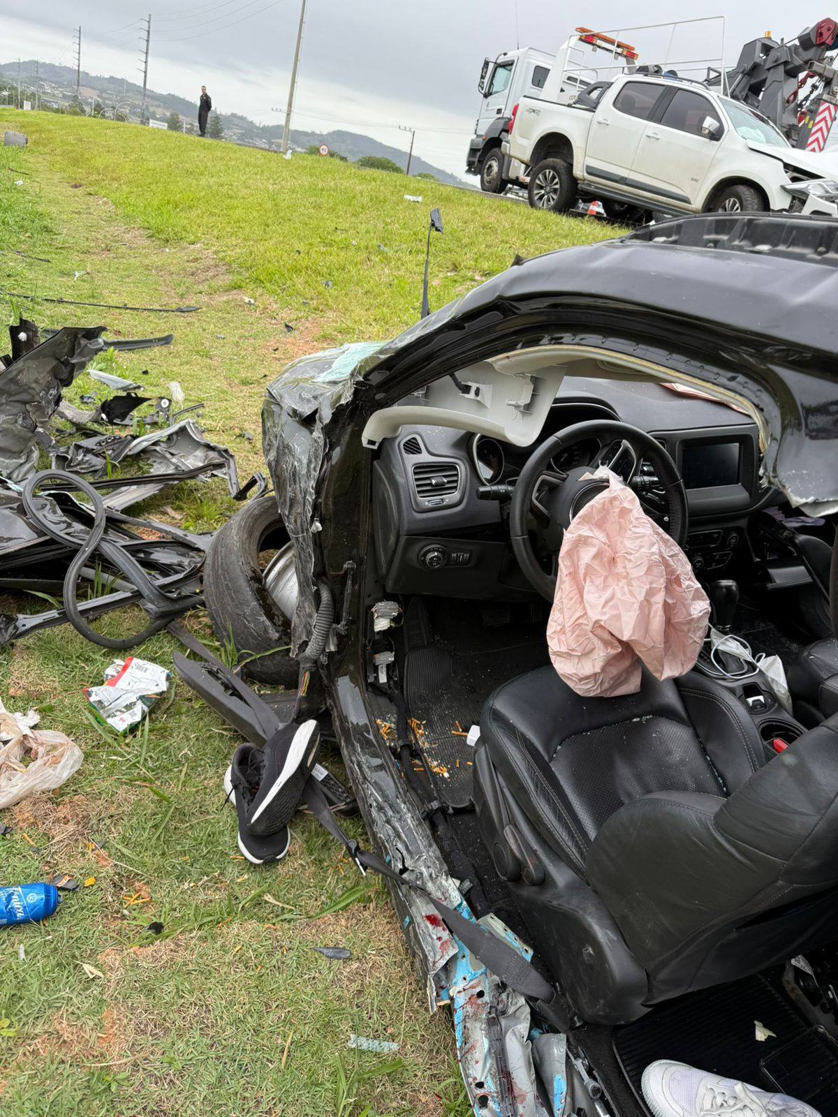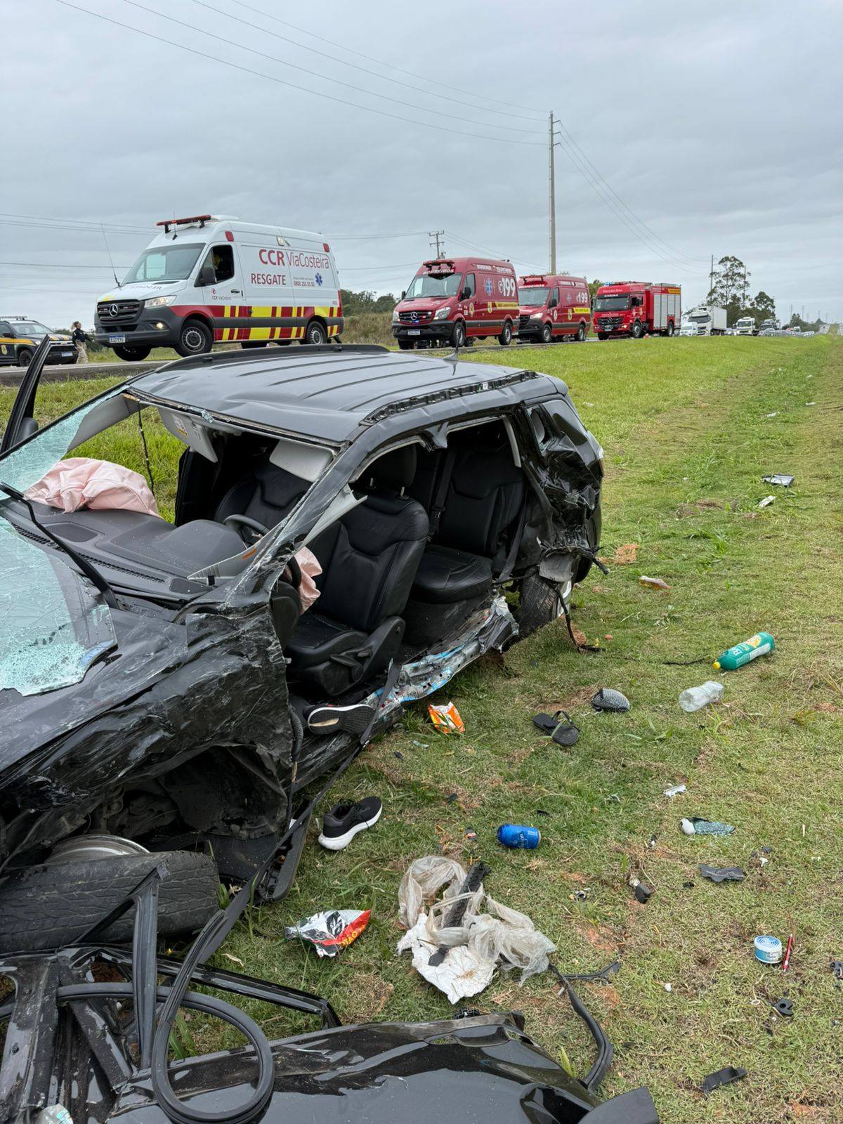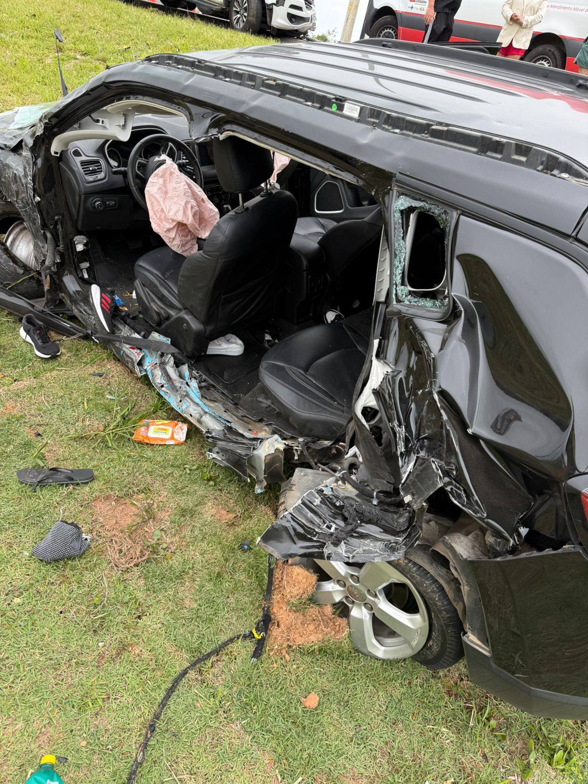 Domingo dia 26/10 por volta das 11h50 os bombeiros voluntários de Jaguaruna ,foram acionados para uma colisão frontal carro x carro na BR 101 Morro Azul – km 352 em Jaguaruna. Chegado no local uma viatura avançada do SAMU que estava passando pelo local na hora do acidente parou para fazer o primeiro atendimento. Constatado 4 vítimas no veiculo Jeep com placa da Paraída, uma feminina 41 anos condutora, o caroneiro do banco da frente um masculino de 25 anos com ferimentos leves, foram protocolados e encaminhados ao hospital referencia em trauma HNSC em Tubarão. Os passageiros do banco traseiro um masculino de 22 anos em estado grave foi entubado na cena e conduzido pela equipe avançada do SAMU ao hospital HNSC em Tubarão, a outra ocupante uma feminina apresentava corte contuso na região frontal da cabeça com suspeita de TCE (trauma cranioencefálico) e ferimentos pelo corpo sendo protocolada e encaminhado ao hospital HCJ pela nossa guarnição. No automóvel S/10 com placas de Joinville um masculino de 60 anos deambulando na cena sem ferimentos assinou recusa de atendimento e transporte no local, a caroneira uma feminina de 59 anos relatava dor na região do pescoço e dificuldade para respirar sendo protocolada e encaminhada ao hospital HCJ em Jaguaruna pela nossa guarnição. Estiveram dando apoio na ocorrência CCR Via Costeira, SAMU/USA, Bombeiro Militar, Saer/Samu Aeromédico e a PRF (Policia Rodoviária Federal)