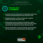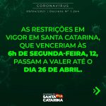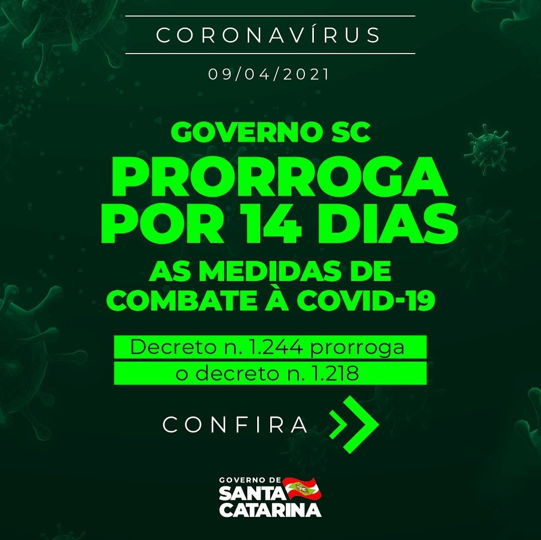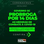 13abril Governo de Santa Catarina prorrogou por 14 dias as medidas de combate à Covid-19 Válidas até 26 de Abril Pandemia As medidas serão válidas até dia 26 de abril. O Governo Municipal de Jaguaruna informa que seguirá as medidas de combate a pandemia adotadas pelo Governo do Estado. Fonte: Ascom Prefeitura de Jaguaruna João Carlos Idalencio Autor