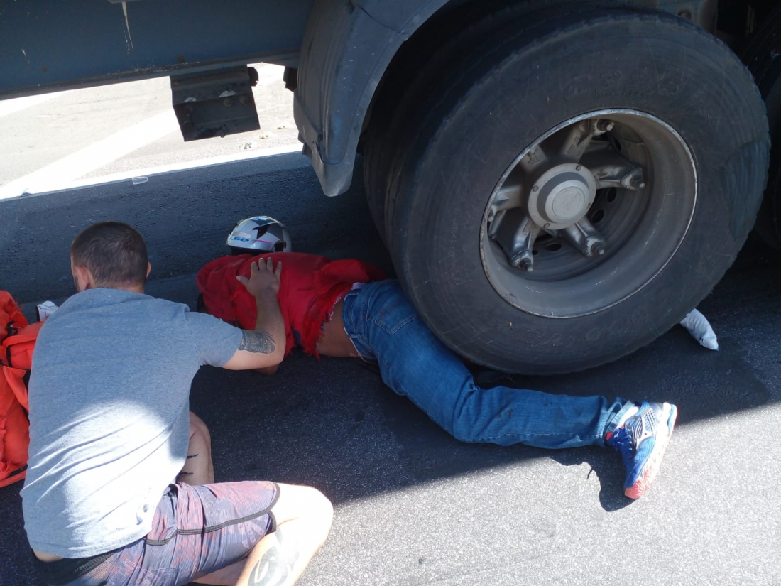 Motociclista é resgatado debaixo de roda de caminhão após batida na BR-101