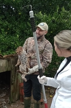 Os Bombeiros Voluntários foram acionados em uma propriedade localizada em Sanga Grande Baixa, em Jaguaruna, para auxiliar na captura de um animal não muito comum: um gato-maracajá. O felino foi encontrado dentro de um galinheiro quando a proprietária foi tratar os animais de estimação.