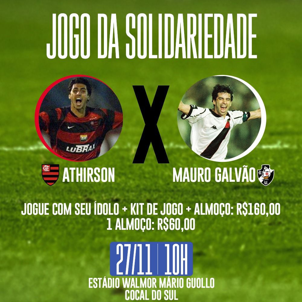 Neste sábado (27), Cocal do Sul sediará pela primeira vez um jogo solidário com a presença de estrelas do futebol nacional. Os craques Athirson e Mauro Galvão irão entrar em campo ao lado dos sul-cocalenses que se inscreveram para o jogo. Além de reunir fãs dos atletas, o evento terá o objetivo de ajudar as famílias necessitadas do município.