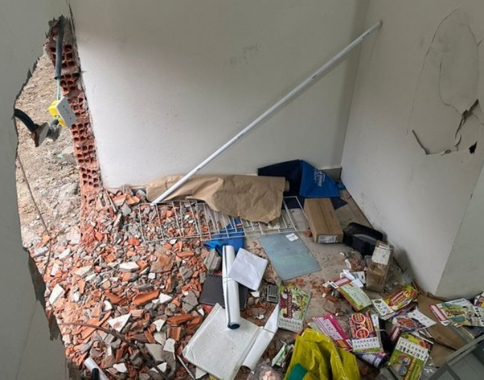 Além de quebrarem a parede, os suspeitos arrancaram uma grade de ferro que, dava acesso a uma sala, onde ficava o cofre da lotérica. Foi realizado contato com o proprietário do estabelecimento, o qual chegou no local e constatou que haviam furtado o cofre, pesando 400 kg, com uma quantia em dinheiro.