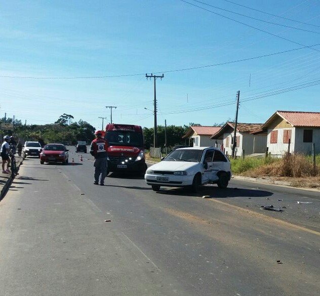 Chegando ao local a guarnição se deparou com uma colisão entre dois veículos, um Voyage com placas de Jaguaruna e um Gol com placas de Imaruí, o acidente foi provocado pois ao atravessar a via um dos veículos atingiu o outro em sua lateral.