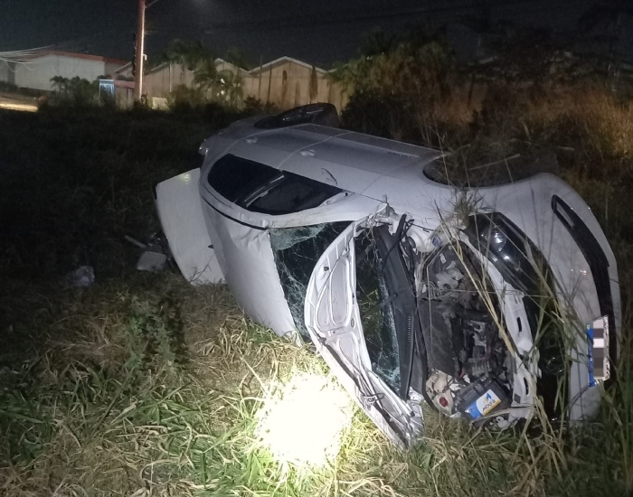 Um veículo VW Voyage capotou na SC-445, no bairro São José, em Içara. O acidente ocorreu na manhã deste domingo, dia 3, por volta das 5h20.