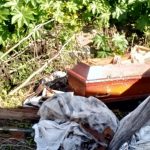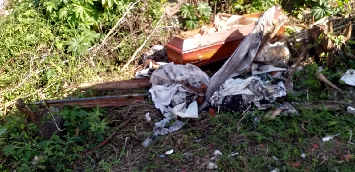 Não bastasse o descaso que acontece a muito tempo com o cemintério de Jaguaruna que em grande parte esta perdido no matagal,agora chegou ao caos,urnas funerárias,resto de roupas de sepultamentos,lixo entulho é o que se encontra na lateral do cemintério municipal de Jaguaruna.