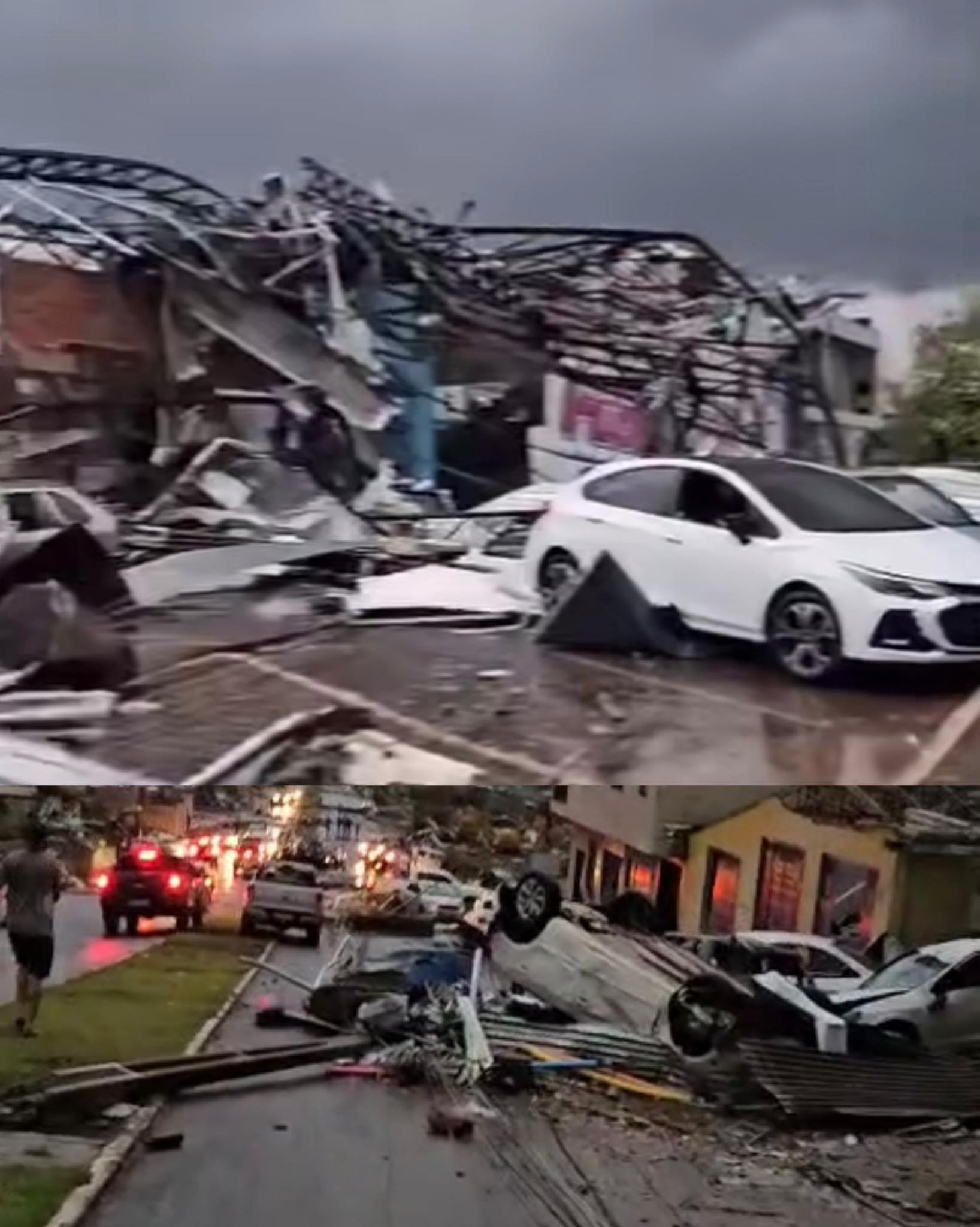 Casas destelhadas, árvores arrancadas e estruturas metálicas retorcidas deram a dimensão do impacto do fenômeno. Em alguns pontos, moradores registraram vídeos que mostram telhados sendo levados e fachadas completamente danificadas.