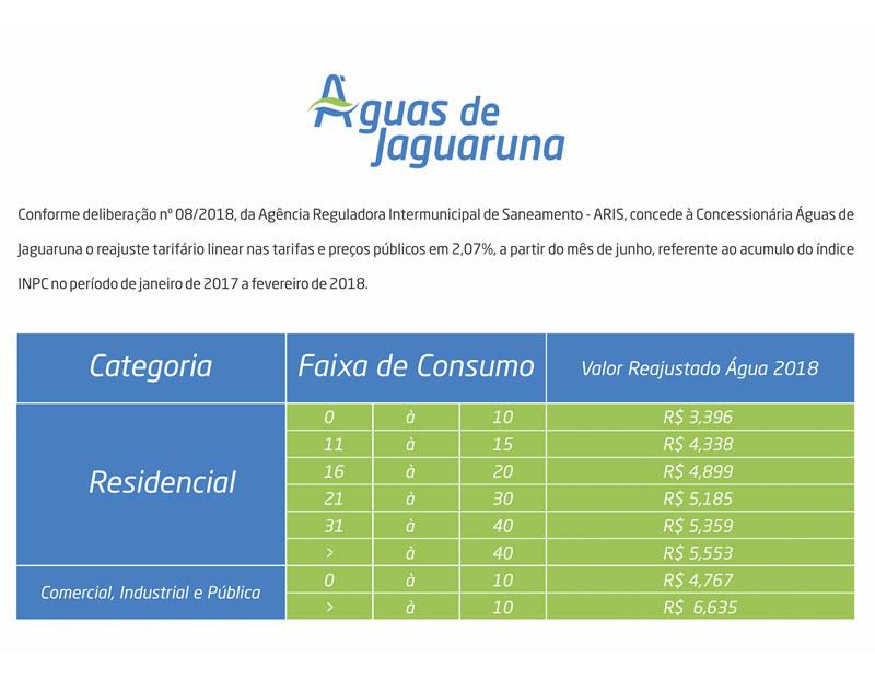 Conforme deliberação nº 08/2018, da Agência Reguladora Intermunicipal de Saneamento – ARIS, concede a Concessionária Água de Jaguaruna o reajuste tarifário linear nas tarifas e preços públicos em 2,07%, a partir do mês de junho, referente ao acúmulo do indíce INPC no período de janeiro de 2017 a fevereiro de 2018.