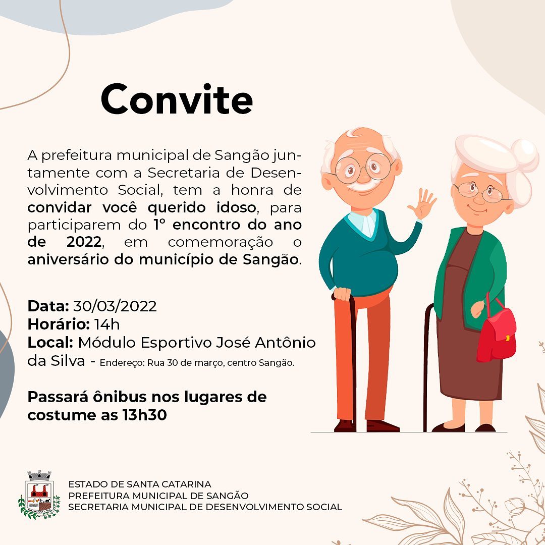 Em comemoração ao aniversário do município de Sangão a Prefeitura junto com a Secretaria de Desenvolvimento Social vem através deste convite, convidar vocês queridos idosos, para participarem do primeiro encontro deste ano.