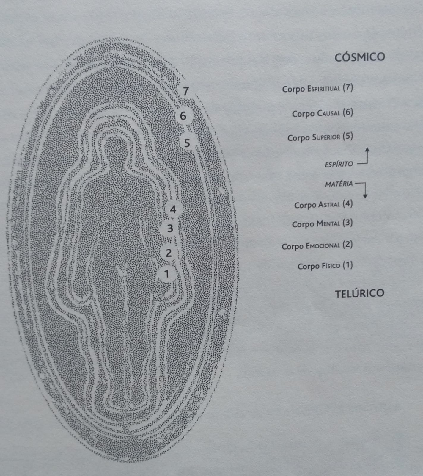 Esplanarei sobre os 7 corpos observados e estudados no campo terapêutico. São eles: o Corpo Físico, Emocional, Mental, Astral, Superior, Causal e o Espiritual. Vale ressaltar, entretanto, que os corpos não são autônomos, pois cada qual carrega em si uma parte do todo e integra, ao mesmo tempo, uma parte de nosso eu.O CORPO FISICO (invólucro do alimento), a princípio, pode parecer estranho que o organismo  material seja a condensação ou o somatório de todos os corpos áuricos. Na verdade, o homem ocidental torna-se egocêntrico ao pensar que o organismo físico seja o emissor do halo brilhante, e isso é uma visão terrena e tridimensional. Contudo, ao se ponderar a encarnação do espírito (vida) e sua evolução (morte terrestre) deduz-se que a luz espiritual antecede ao campo material. Logo, é o espírito quem fornece a luminosidade, é dele o brilho, e não do plano material.