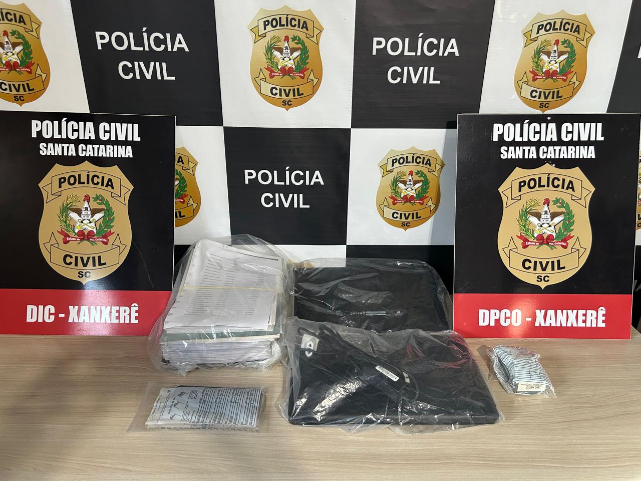 Nas buscas, foram apreendidos vários contratos de compra e venda de lotes rurais e dois notebooks. Também foi localizada uma caixa com 45 munições calibre .380 sem documentação, motivo pelo qual foi preso em flagrante. O mandado foi expedido pela Vara Regional de Garantias da Comarca de Concórdia.
