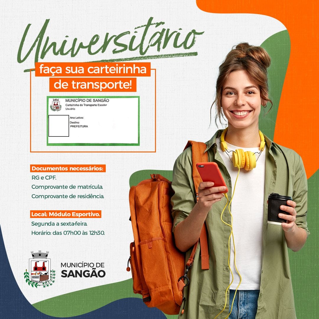 Os estudantes de Sangão que ainda não possuem a carteirinha para o transporte escolar, devem comparecer na secretaria de transporte, localizada no Módulo Esportivo, para a realização da mesma, de segunda a sexta-feira, das 07:00 às 12h30.