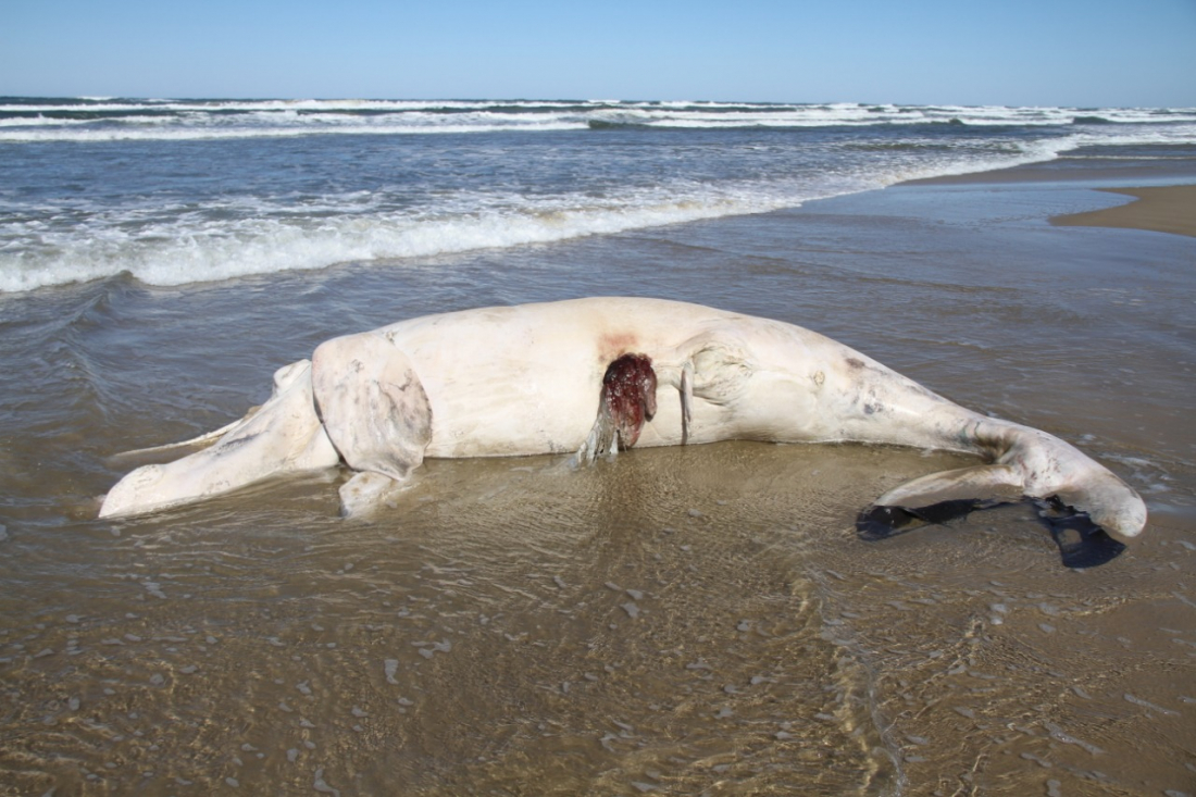 Filhote de baleia-franca encalha sem vida na Praia do Camacho, em Jaguaruna