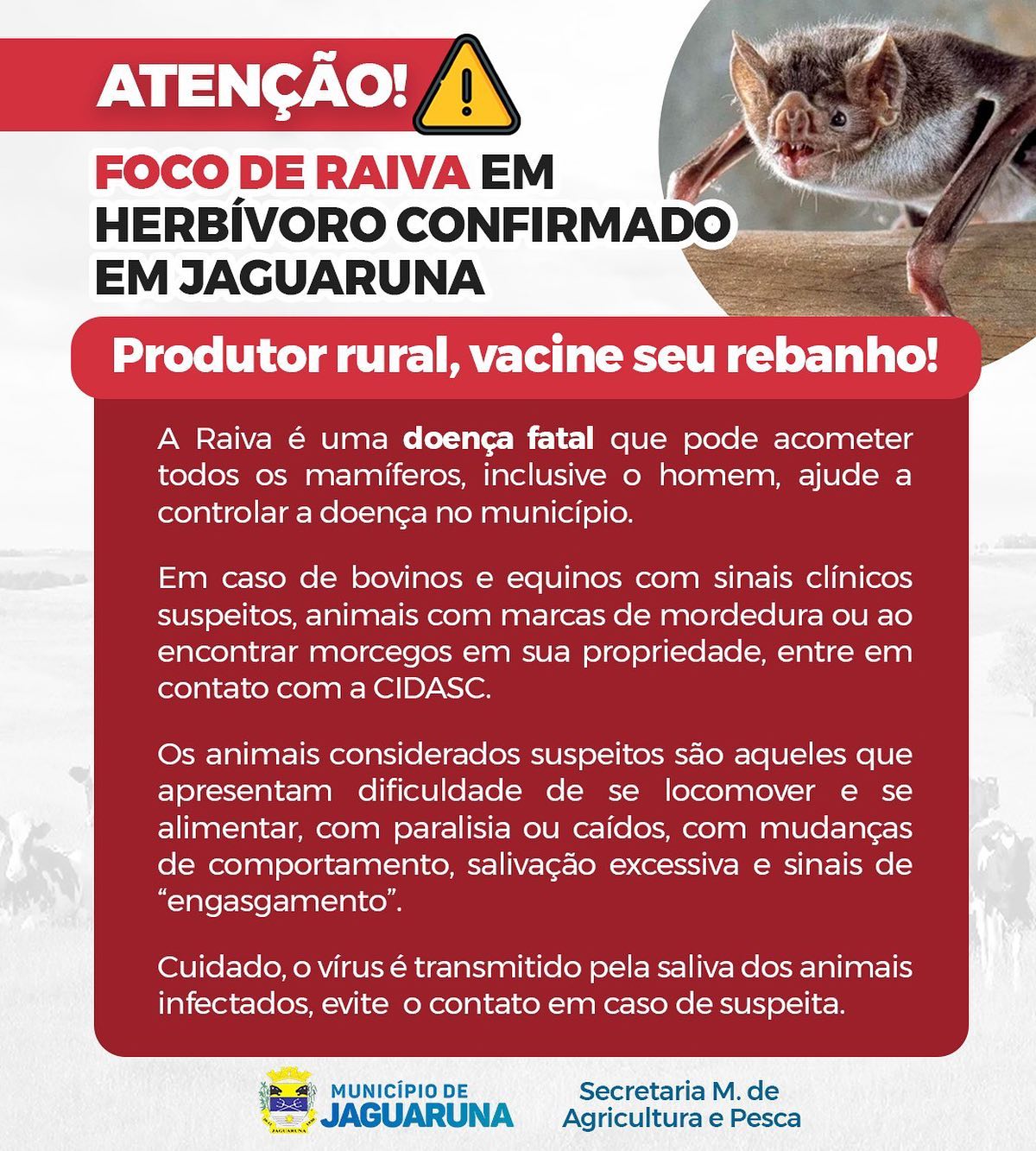 A Raiva é uma doença fatal e sem tratamento que pode acometer todos os mamíferos, inclusive o homem. Produtor rural, ajude a controlar a doença no município e a manter a saúde dos animais, vacinando seu rebanho contra o vírus.