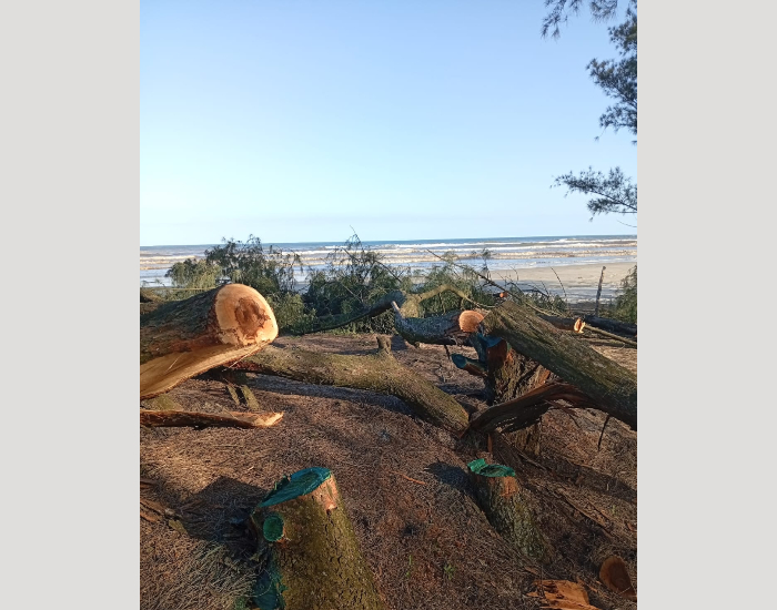 Simplesmente vieram aqui e cortaram as árvores. Nossa preocupação é que essas árvores acabavam segurando as dunas e isso pode ser um problema. Queremos explicações”, relata o morador Kleber Viana após equipes do Instituto Chico Mendes de Conservação da Biodiversidade (ICMBio) realizarem uma operação de cortes de árvores da espécie Casuarina Equisetifolia no Balneário Cascata Vermelha, em Jaguaruna.
