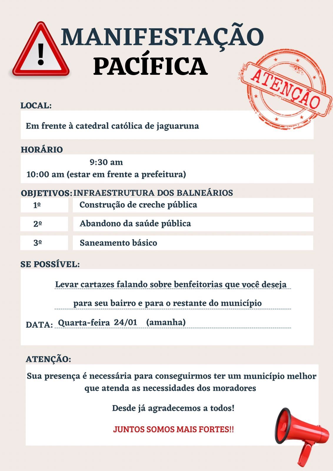 Moradores do município de Jaguaruna estarão reunidos nesta quarta-feira, dia 24, em frente à prefeitura, a partir das 10h, para uma manifestação.