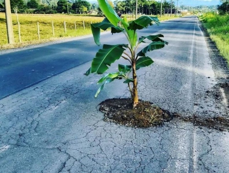 Um pé de banana foi plantado em um buraco na rodovia Genésio Mazon (SC-445), que liga as cidades de Morro da Fumaça e Urussanga. A imagem circulou pelas redes sociais em forma de protesto contra a infraestrutura da rodovia estadual.