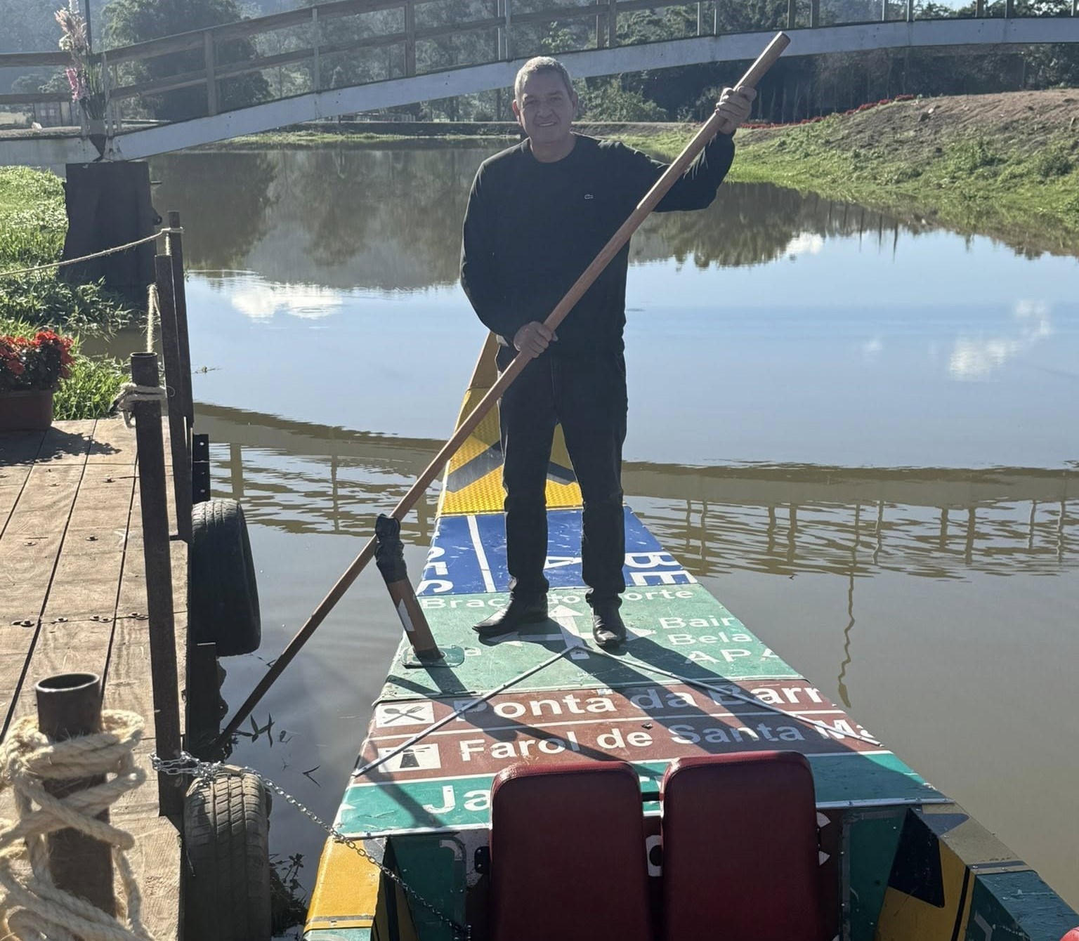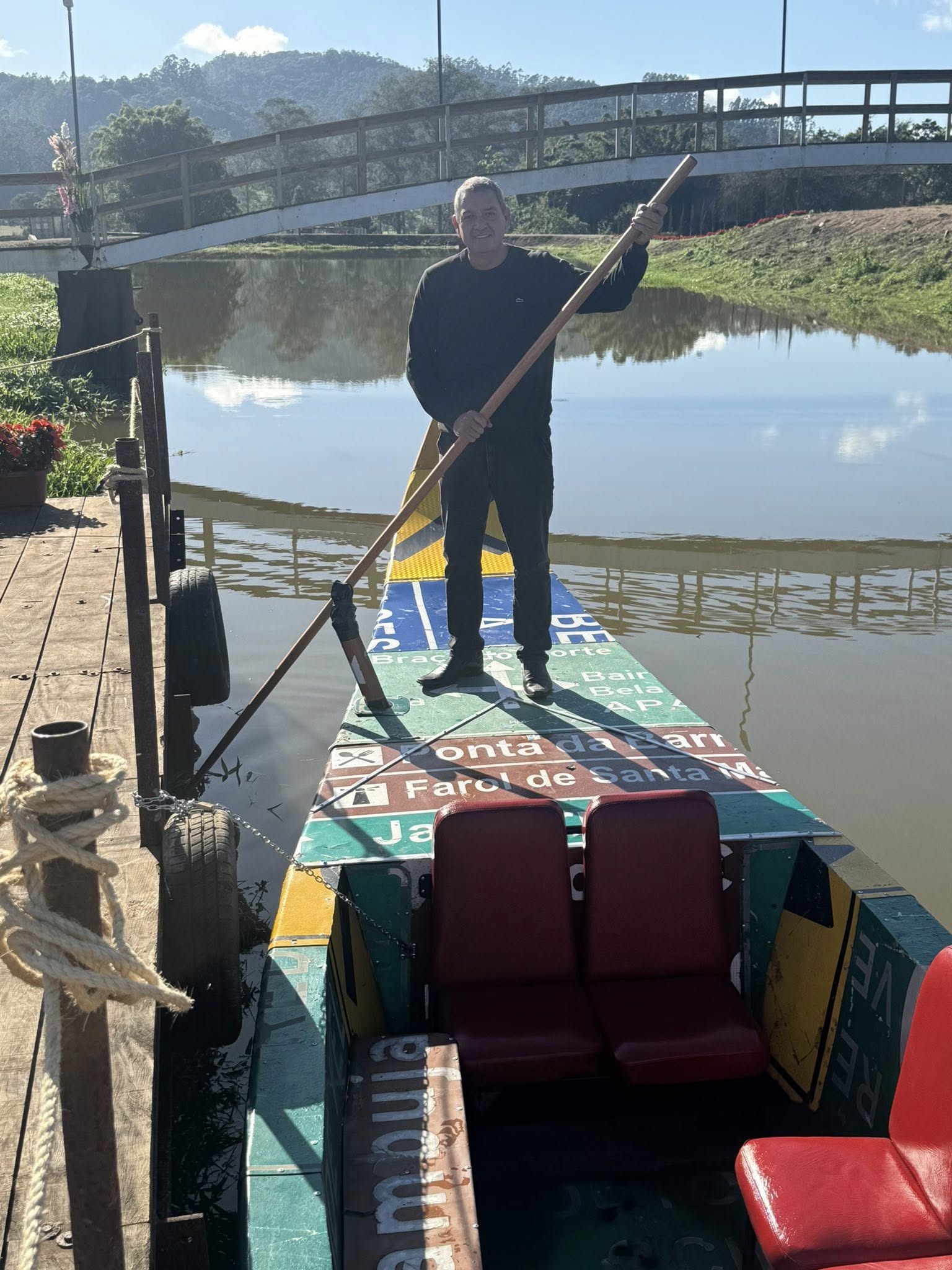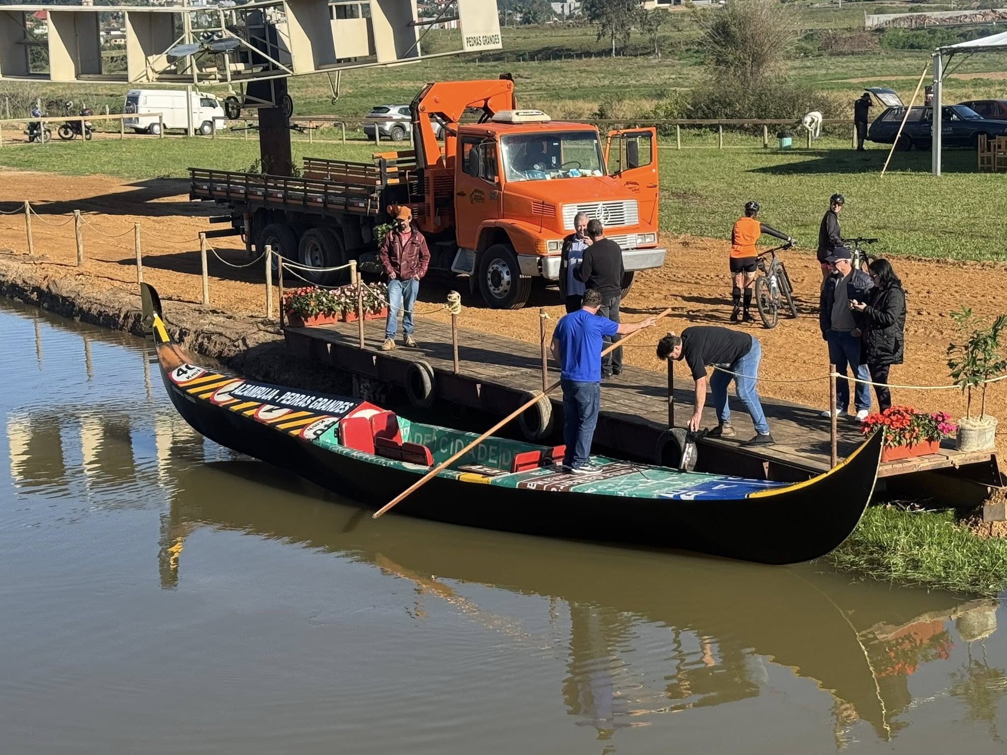 O Município de Pedras Grandes (SC) ganhou neste sábado, 21 de junho, uma nova e original atração turística: uma gôndola veneziana navegável, construída com placas de sinalização rodoviária doadas pelo Deinfra. A embarcação é uma réplica fiel das tradicionais gôndolas de Veneza, medindo 10,7 metros de comprimento, com capacidade para até oito passageiros.