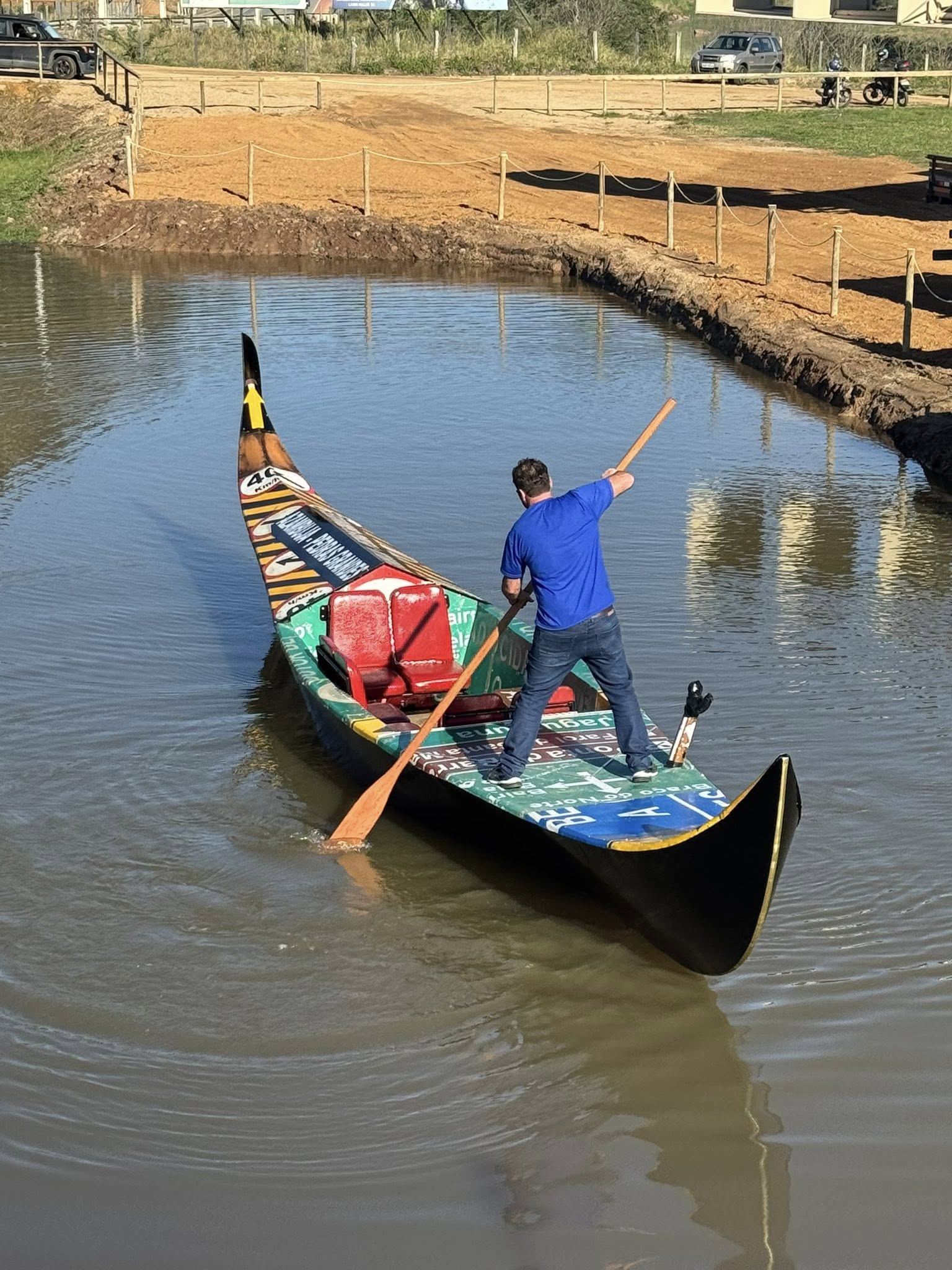 A estrutura da gôndola segue rigorosamente o padrão das originais venezianas: perfil alongado, cor preta e detalhes ornamentais, agregando um diferencial sustentável que transforma o descarte em arte e turismo.