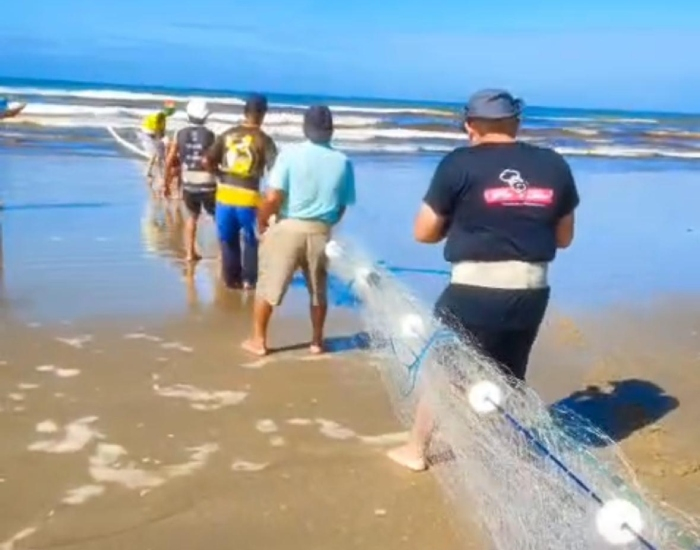 As redes foram puxadas por diversos pescadores que calculam a quantidade capturada.