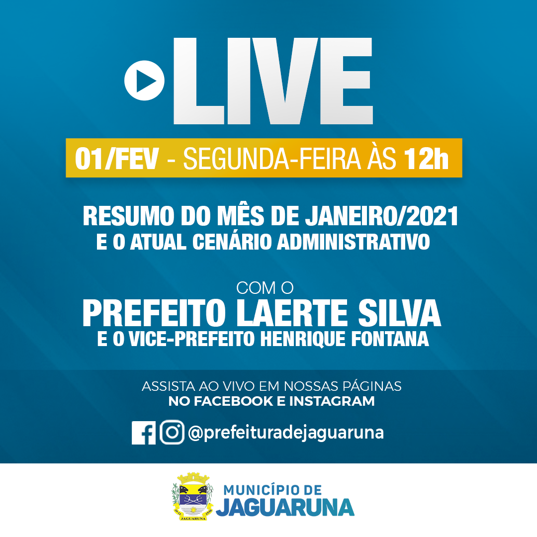 Nesta segunda-feira (01), a partir das 12h, o prefeito Laerte Silva e o vice-prefeito Henrique Fontana estarão realizando uma live nas páginas oficiais da Prefeitura de Jaguaruna.