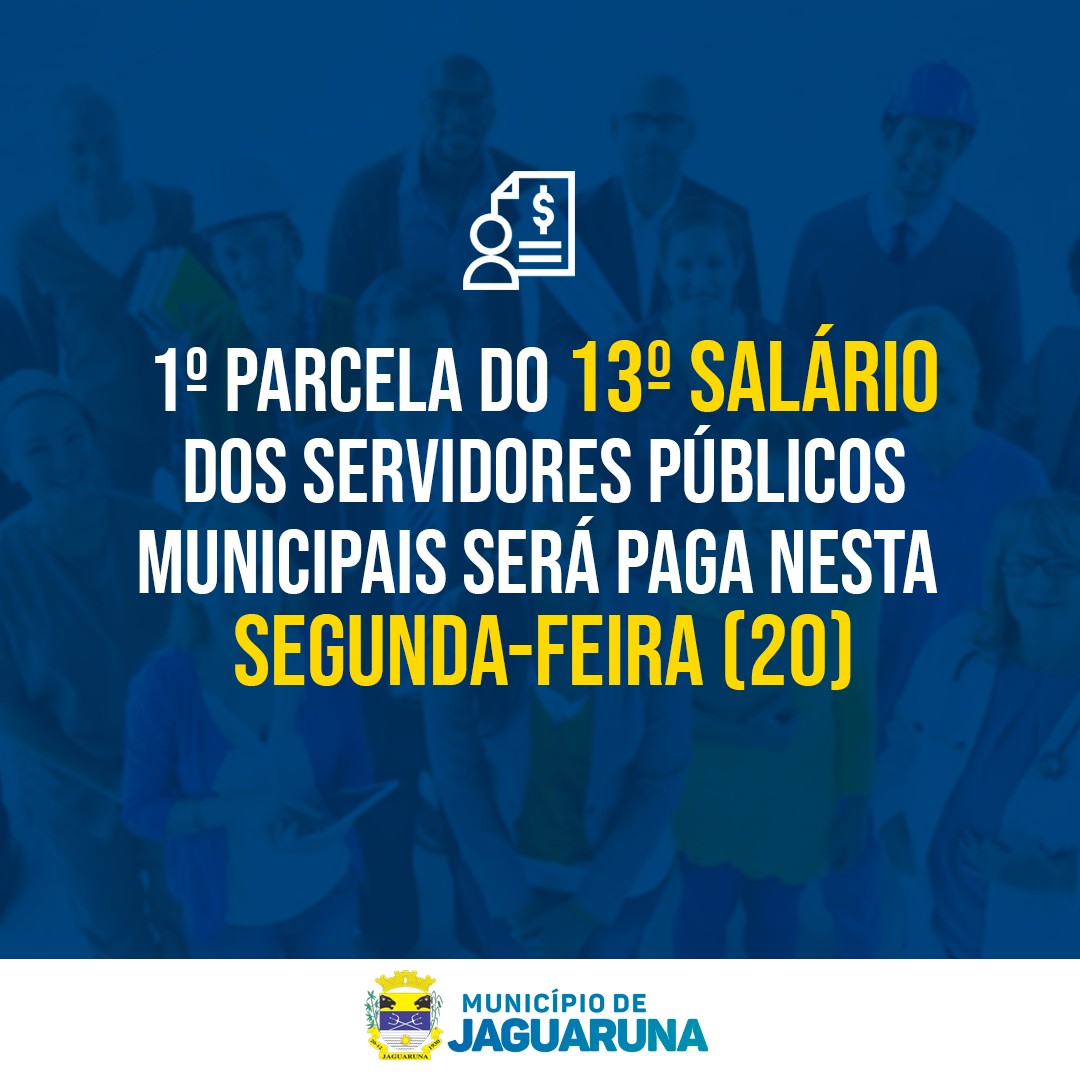 A Prefeitura de Jaguaruna irá efetuar o pagamento da primeira parcela do 13º salário dos servidores públicos nesta próxima segunda-feira, dia 20 de junho, a segunda parcela do décimo será paga em dezembro de 2022.