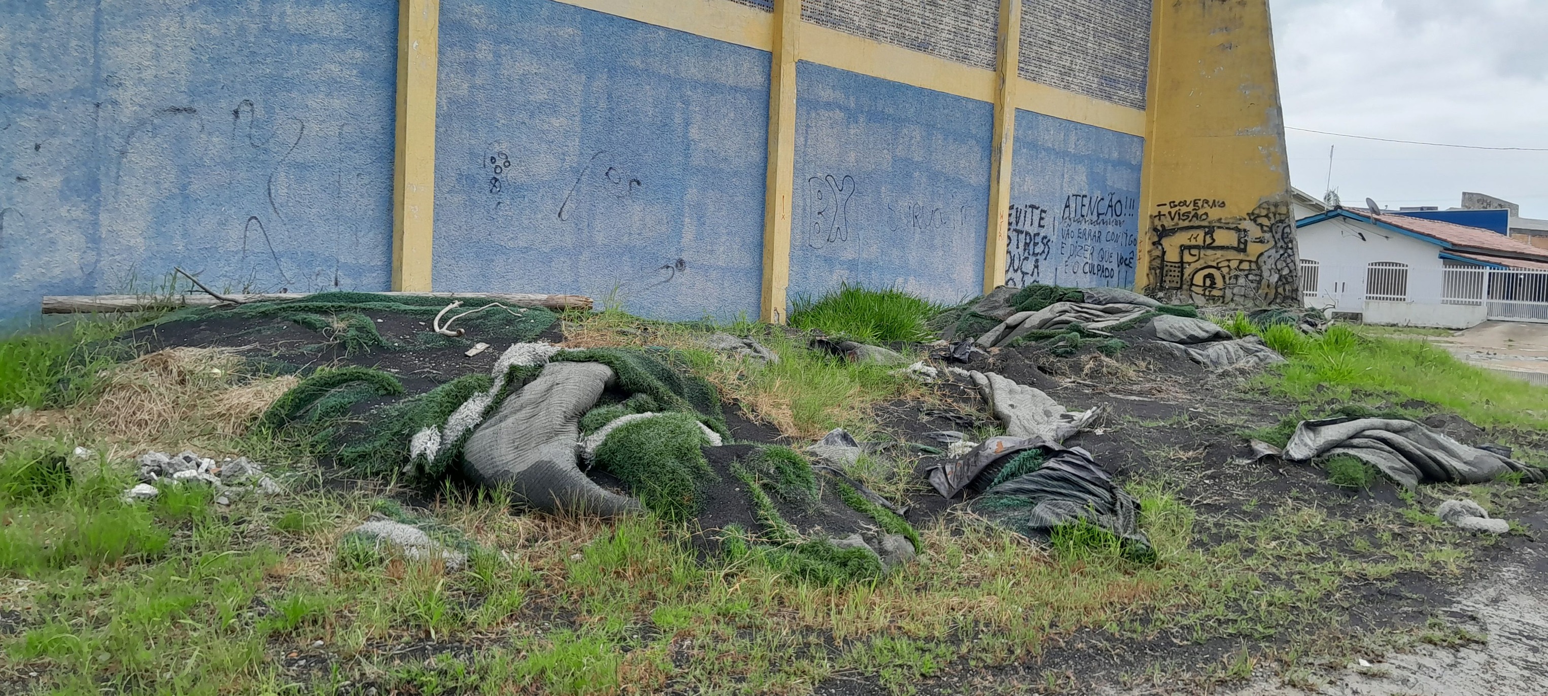 Descaso com a antiga Grama Sintética Retirada do Campo ao Lado do Ginásio de Esportes em Jaguaruna, Poderá Causar dano ao meio ambiente e a atmosfera configurando impacto ambiental.
