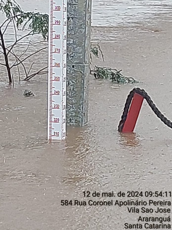 Devido às fortes chuvas que afetam a região, o nível do Rio Araranguá está subindo rapidamente e preocupa autoridades. Conforme o Diretor de Comunicação e Chefe de Gabinete da Prefeitura de Araranguá, Sandro Ramos, o rio já atingiu 2,17 metros acima do nível normal.