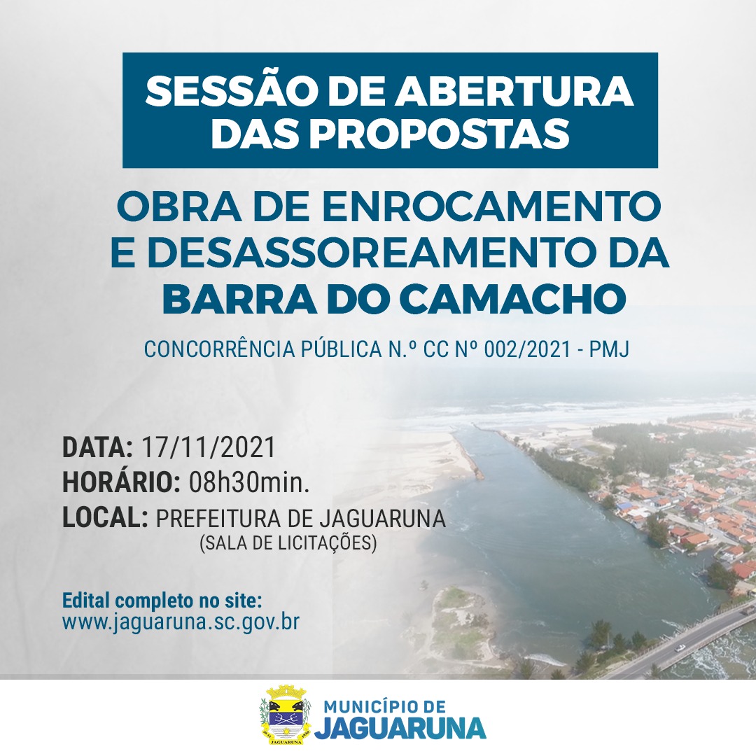 A prefeitura Municipal de Jaguaruna divulgou a data para a sessão de abertura das propostas da obra do desassoreamento e enroncamento da barra do Camacho,o evento acontecerá dia 17 de novembro de 2021 as 8:30 da manhã na salade licitações da Prefeitura de jaguaruna.