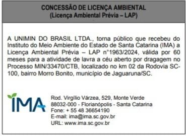 A UNIMIN DO BRASIL LTDA., torna público que recebeu do
