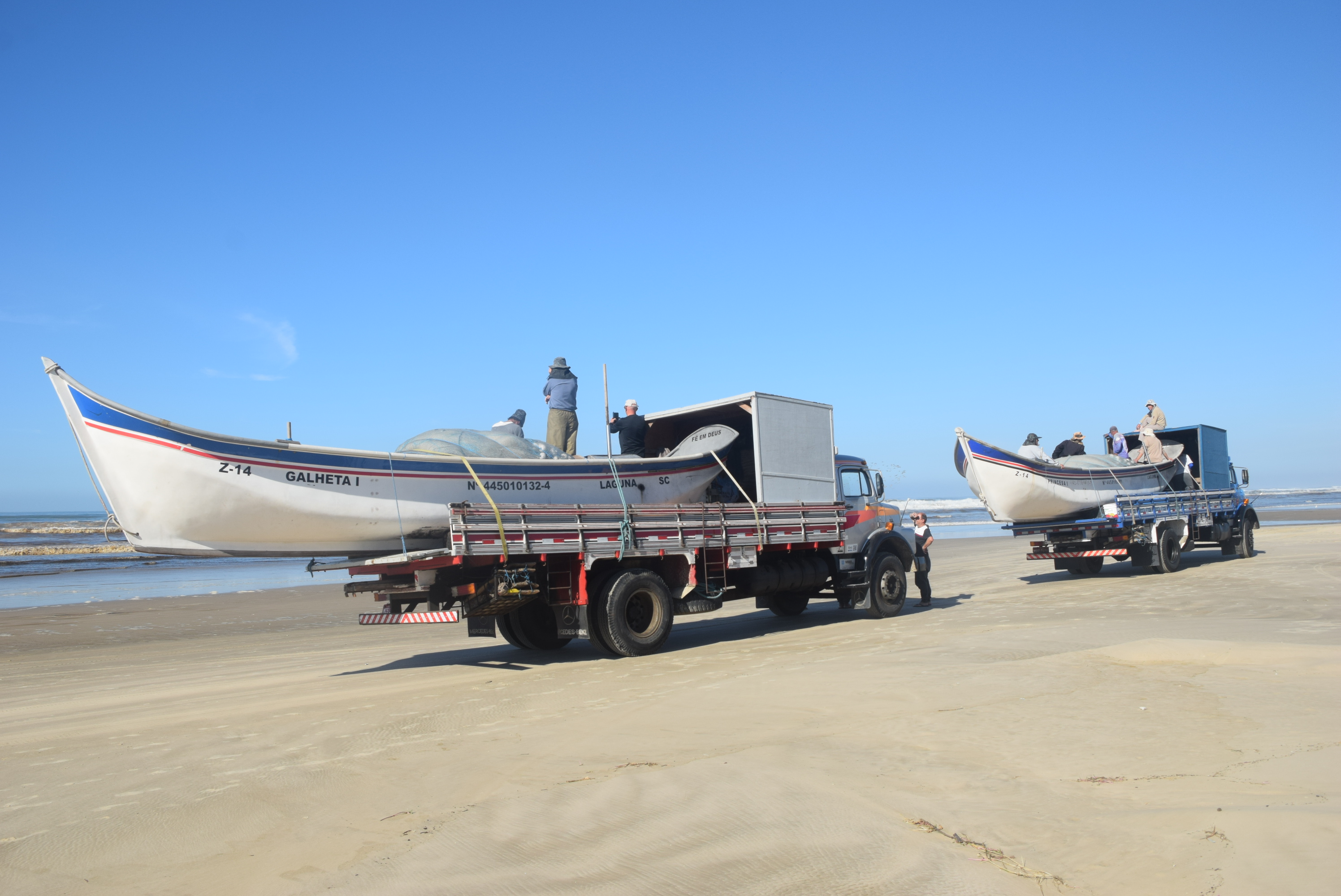Em Jaguaruna, pescadores transitam à beira-mar com caminhões carregados com barcos e redes