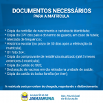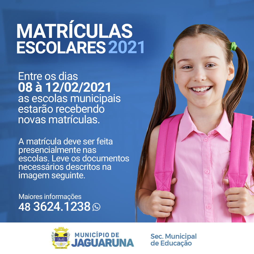 Entres os dias 08 à 12/02/2021 as escolas municipais estarão recebendo novas matrículas. Compareça até a escola mais próxima para a realização da matrícula do aluno.
