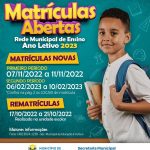 O primeiro período das matrículas novas será entre os dias 07/11/2022 e 11/11/2022 e o segundo período acontece entre os dias 06/02/2023 e 10/02/2023.