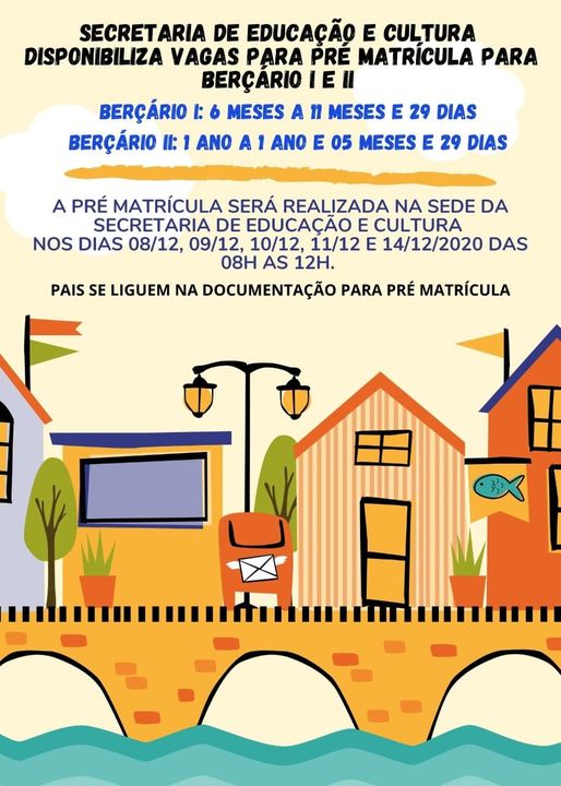 A Pré-Matrícula será realizada na Sede da Secretaria de Educação e Cultura nos dias 08, 09, 10, 11 e 14/12/2020 das 08h ás 12h.