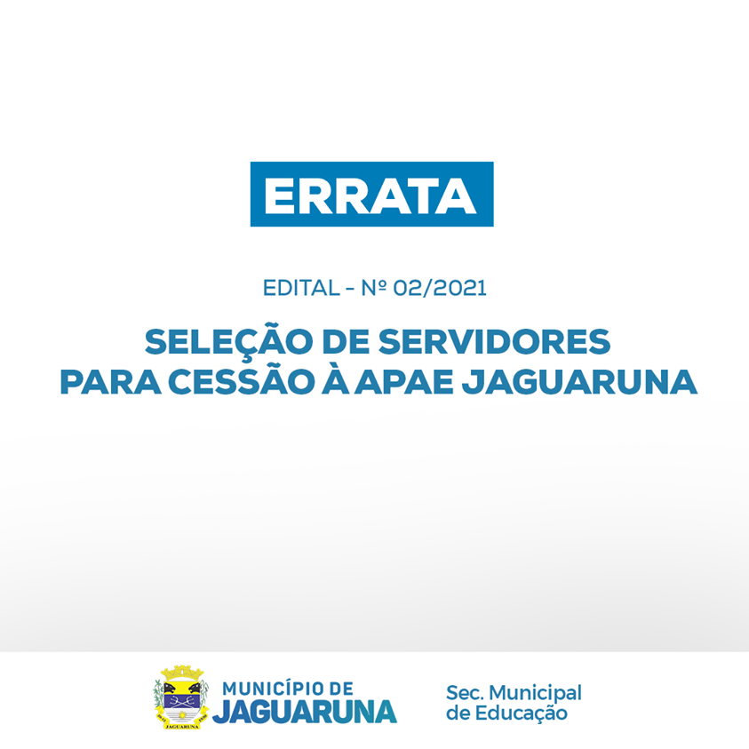 29janeiro Prefeitura de Jaguaruna-Errata do Processo de Seleção de Servidores para Cessão à APAE Jaguaruna Jaguaruna Errata do Processo de Seleção de Servidores para Cessão à APAE Jaguaruna Clique e confira: https://www.jaguaruna.sc.gov.br/…/errata-do-processo-de… João Carlos Idalencio Autor