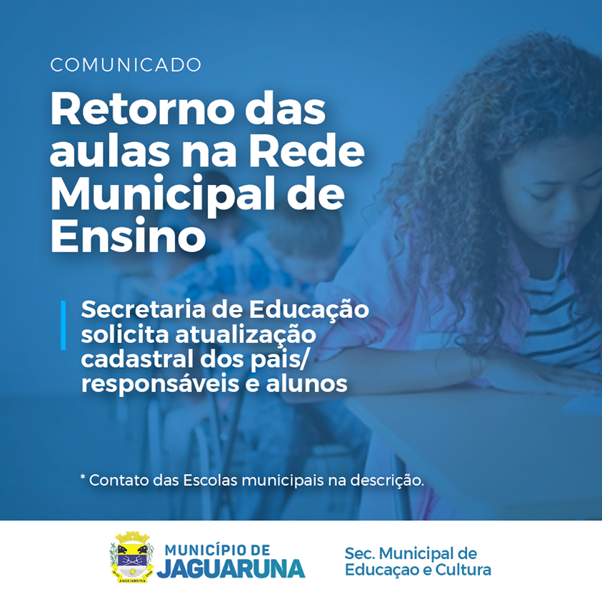 A Secretaria Municipal de Educação informa que o retorno das aulas está previsto para 22 de fevereiro de 2021, e solicita aos pais/responsáveis pelos alunos que compareçam à escola, onde seu filho está matriculado, para realizar a atualização cadastral, no período de 25 a 27 de janeiro das 8h às 12h.