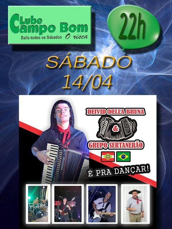 14abril Clube Campo Bom promove neste sábado 14/04 super baile animação Deivid Dela Bruna e Grupo Sertanerão Jaguaruna O Clube Campo Bom promove neste sábado super Baile com animação de Deivid Dela Bruna e Grupo Sertanerão,Inicio 22:00 Horas Divirta-se pra valer no melhor baile da região Clube campo Bom Balneário campo Bom Jaguaruna Fonte:Clube Campo Bom João Carlos Idalencio Autor