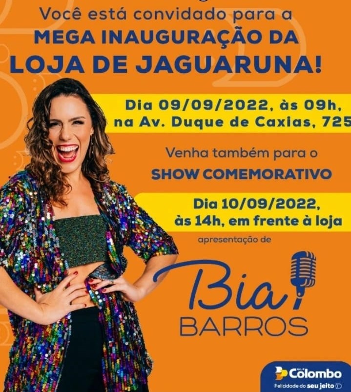 Alô Jaguarunenses vem aí nos dias 09 e 10 de Setembro sexta e sábado a super festa de inauguração das Lojas colombo em Jaguarunam,não perca este grande evento ,dia 09 a grande abertura com a inauguração das Lojas Colombo com muitas promoções de inauguração pra você ,e no dia 10 sábado super show nacional com Bia barros você não vai querer perder esta super festa vai.