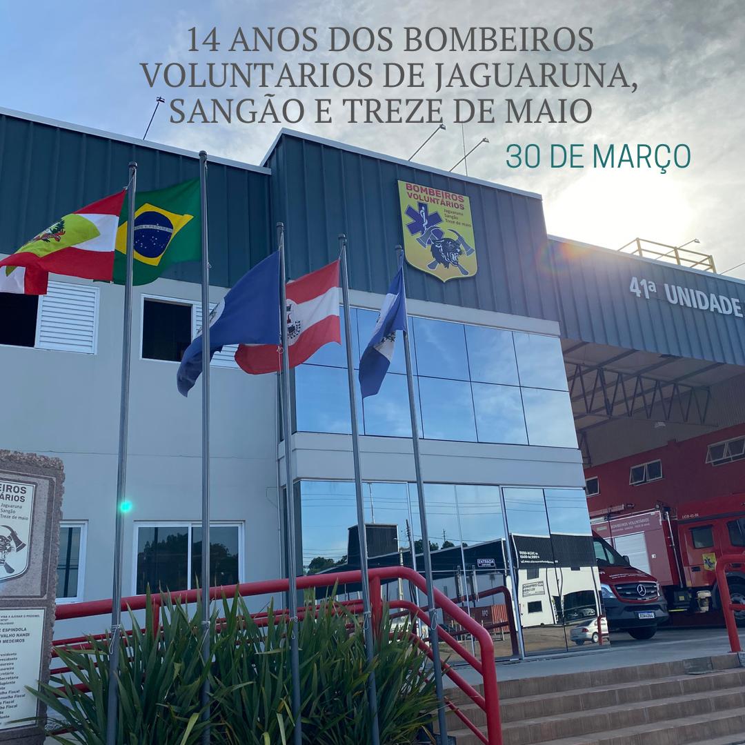 Os Bombeiros Voluntários de Jaguaruna, Sangão e Treze De Maio comemoram hoje 30/03 (14) quatorze anos de história. Nos sentimos orgulhosos pela trajetória de serviços prestados à sociedade, uma história digna de grande respeito conquistada com muito esforço, comprometimento e dedicação. Obrigado a todos que acompanham nossa caminhada e principalmente aos nossos guerreiros que fazem parte de cada conquista alcançada!