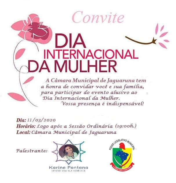 A Câmara Municipal de Vereadores de Jaguaruna ,por iniciativa das Vereadoras Terezinha de Souza Nandi,Graziela Seláu Schmitz e Joelma de Miranda Cruz, promove no próximo dia 11 de março de 2010 ,uma palestra alusiva ao dia internacional da mulher.