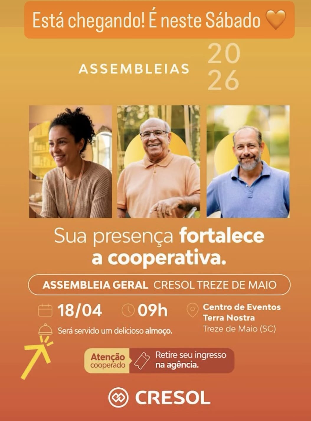 16abril Convite Cresol Treze de Maio -Assembléia Geral dia 18 de Abril as 9:00 Horas da Manha Centro de Eventos Terra Nostra Treze de Maio Convite Cresol Treze de Maio -Assembléia Geral dia 18 de Abril as 9:00 Horas da Manha Centro de Eventos Terra Nostra Fonte: Ascom :Cresol Treze de maio João Carlos Idalencio Autor