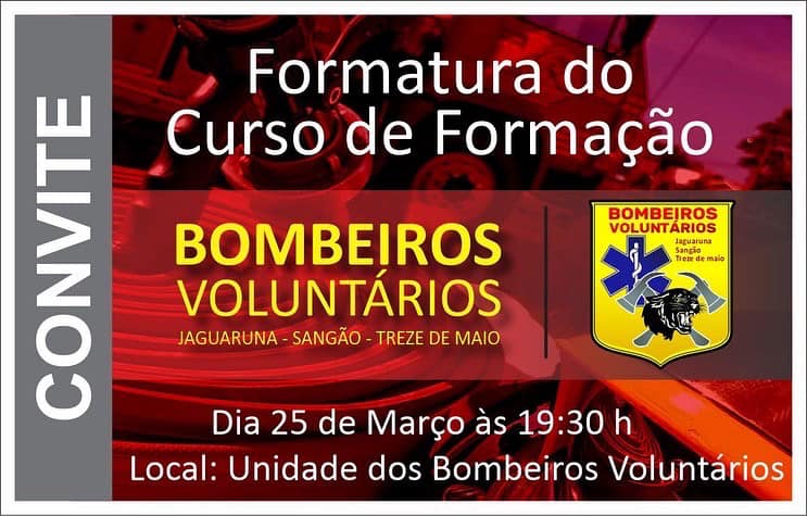 25março Convite Formatura Curso de Formação Bombeiros Voluntários de Jaguaruna Jaguaruna Convite Formatura Curso de Formação Bombeiros Voluntários de Jaguaruna Fonte: Ascom Bombeiros Voluntários de Jaguaruna João Carlos Idalencio Autor