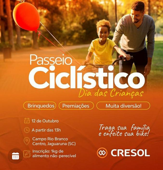 A C resol Jaguaruna convida a familia Jaguarunense ,e todas as criânças ,para comemorar o dia da criânça com o tradicional passeio ciclístico da Cresol. Dia 12 de Outubro enfeite sua bike e leve sua família para aproveitar uma tarde de muita diversão .