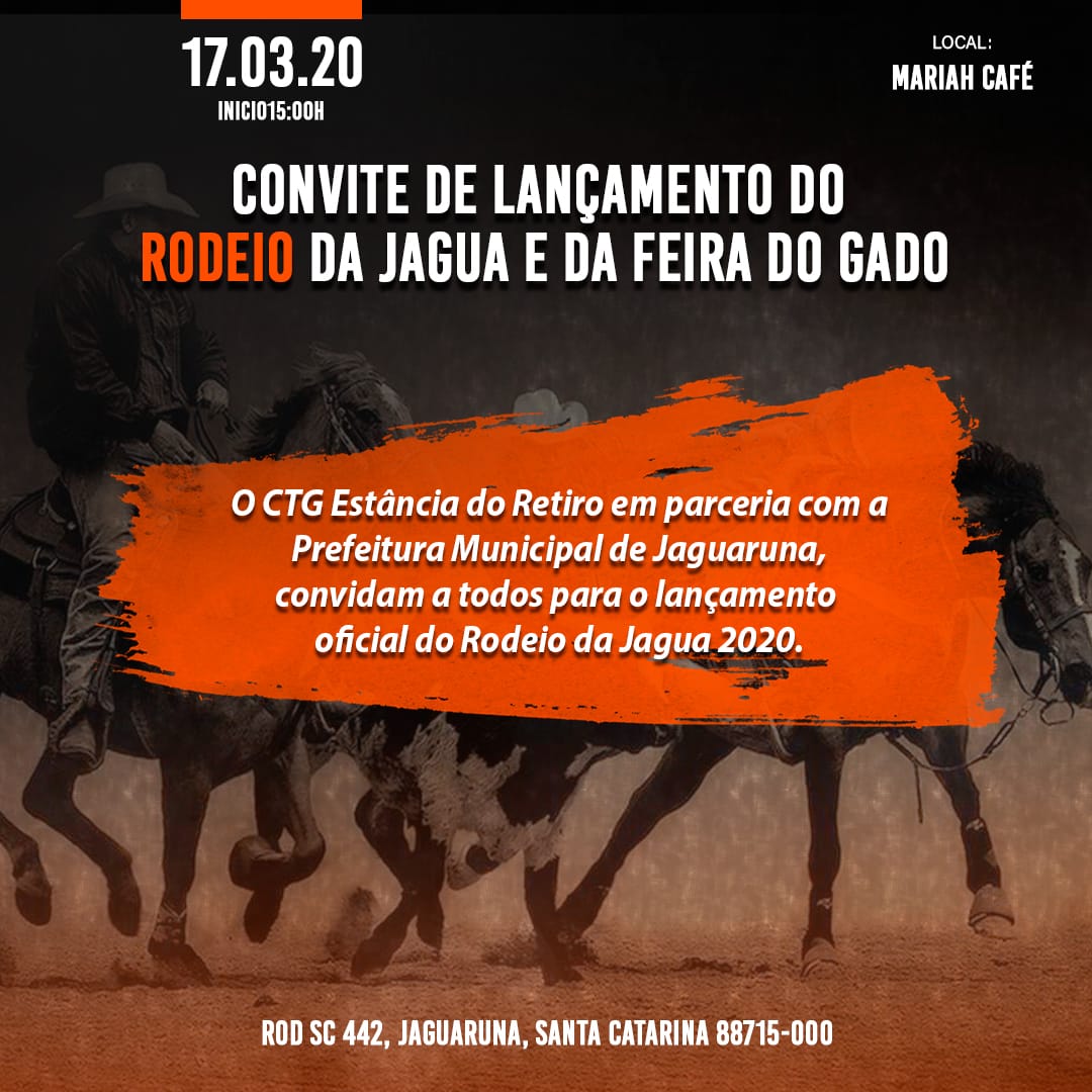 O Patrão do CTG Estância do Reito de Jaguaruna Agnaldo Serafim ,juntamente com sua patronagem ,convida para o lançamento do Rodeio da Jagua 37 anos e da feira do gado ,evento que acontecerá dia 17 de março 2020 as 15:00 Horas nas dependencias do Mariha Café na SC Arno Arnaldo Nápoli proximidades da sede dos bombeiros voluntários de Jaguaruna.