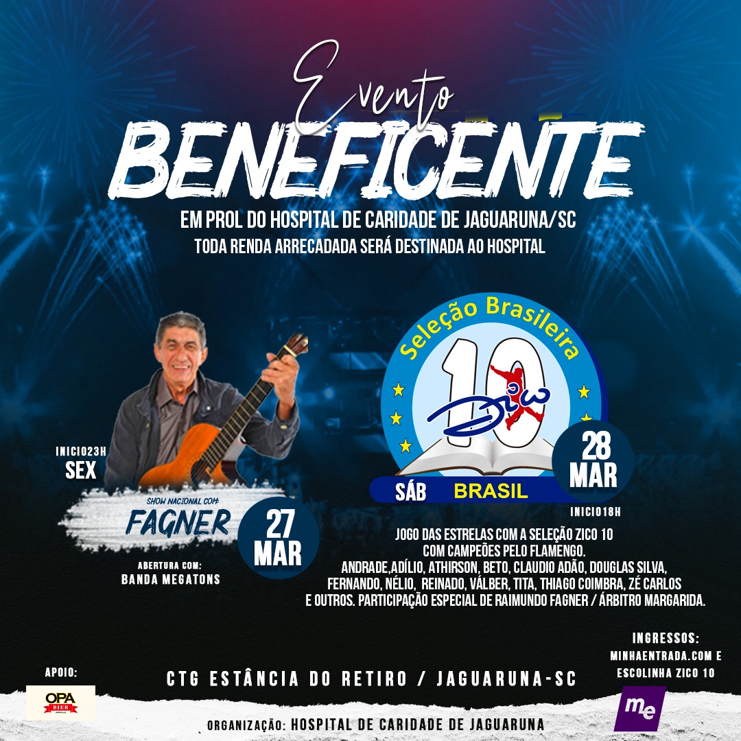 O dia 27 de março sexta feira será inesquecível para os Jaguarunenses,grande evento beneficênte em benefício do Hospital de Caridade de Jaguaruna e Abertura Show com Cantor Fagner e abertura com a Banda Megatons início 23:00 Horas.