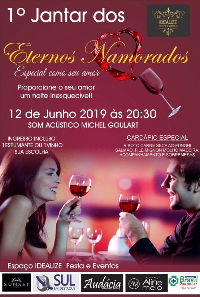 Idealize Eventos realiza no dia 12 de junho 2019 quarta feira o 1º Jantar dos Eternos Namorados,especial com seu amor.