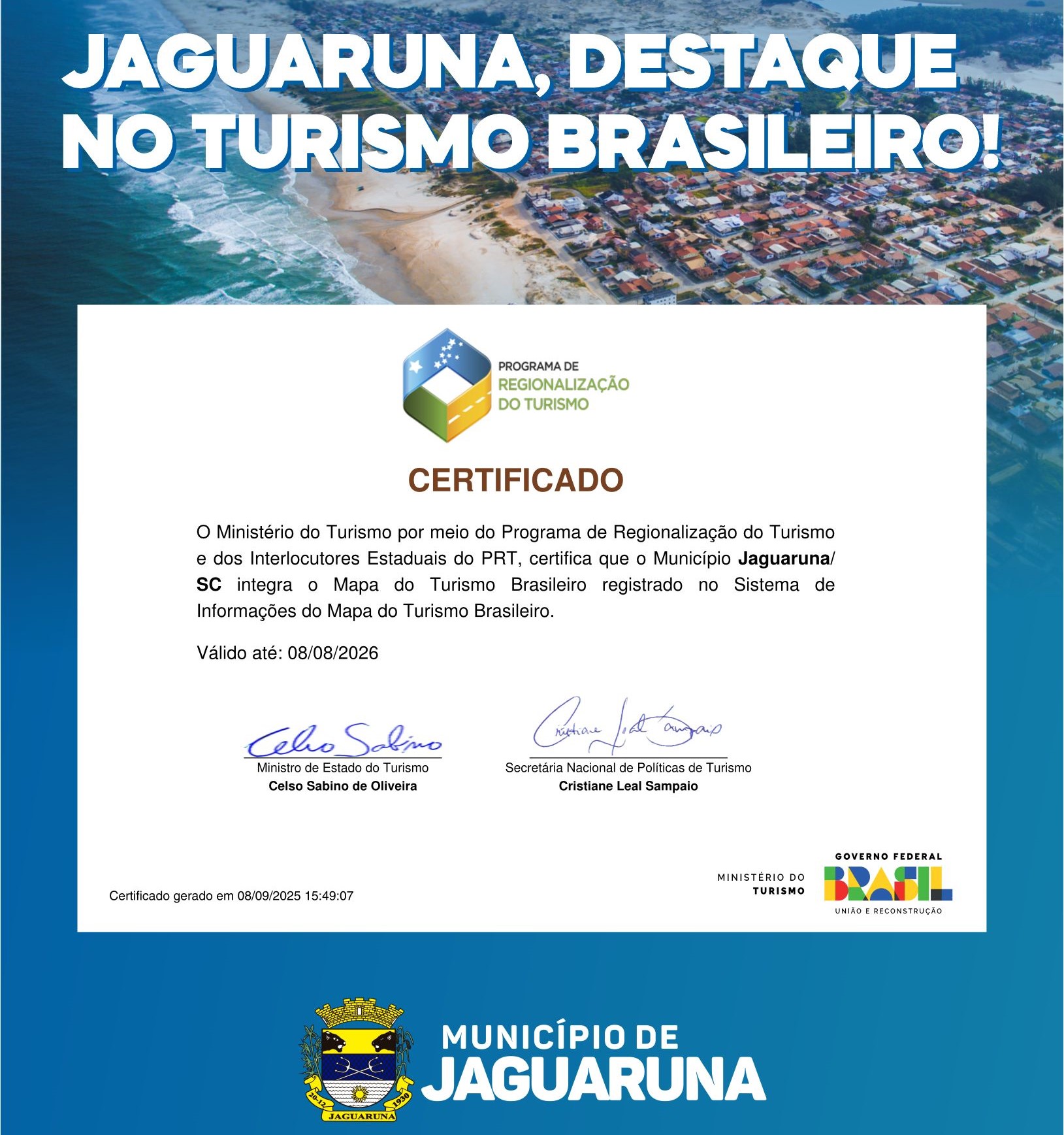Pela primeira vez, nosso município alcança a classificação mais alta no Mapa do Turismo Brasileiro — um marco histórico para Jaguaruna!