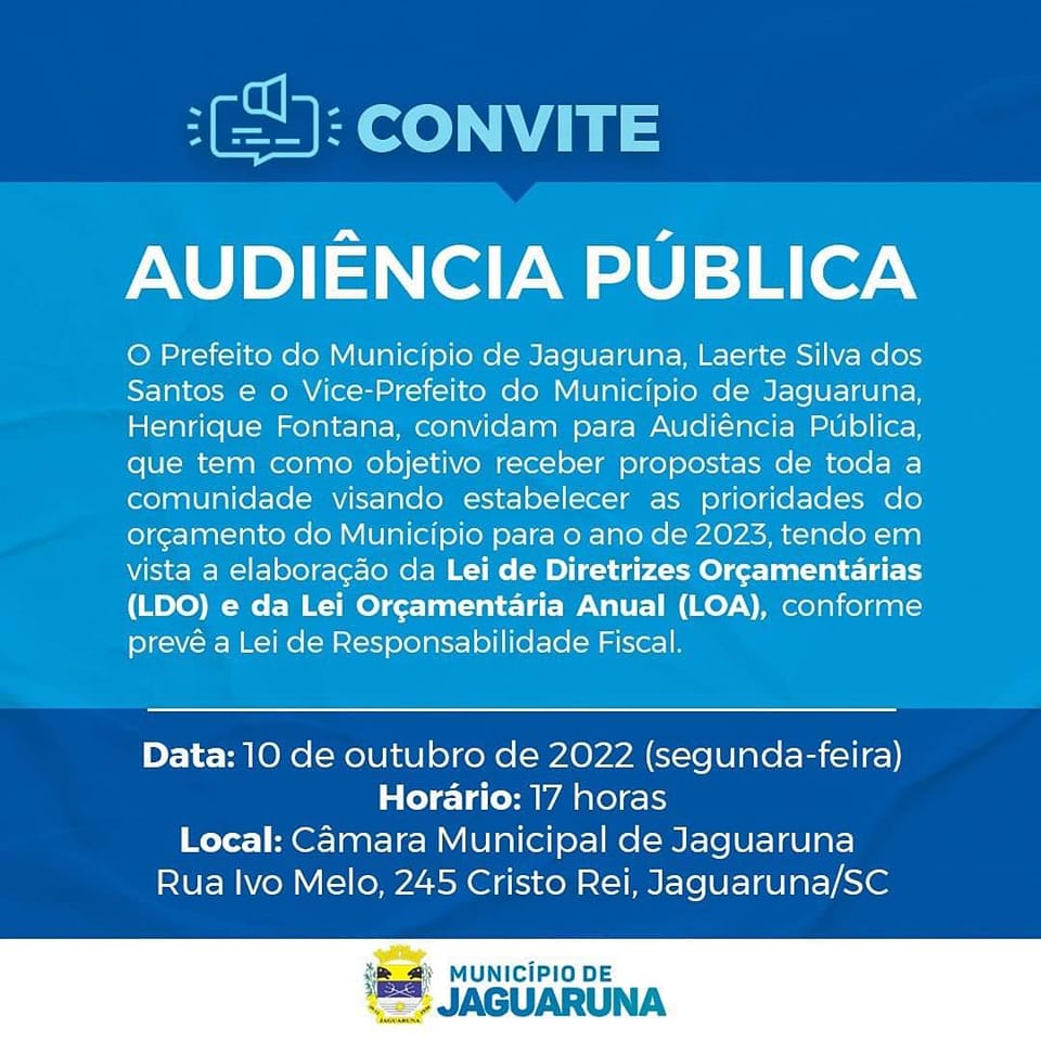 05outubro Jaguaruna Convite Audiência Pública Jaguaruna Convite Audiência Pública Fonte: Ascom Prefeitura de Jaguaruna João Carlos Idalencio Autor
