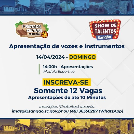Você sangãoense que deseja mostrar o seu talento musical, eis a oportunidade. Encontram-se abertas as inscrições para apresentação do Show de Talentos no palco da 1ª Festa da Cultura de Sangão.
