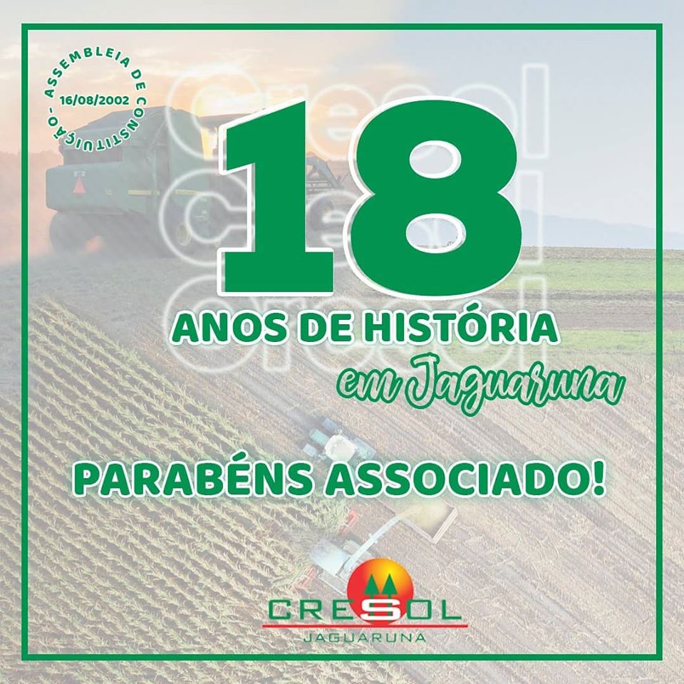A construção de um sonho que hoje é uma realidade! Mas, para isso, foi preciso muita luta, dedicação e organização. Uma história sólida de crescimento que resultou em uma cooperativa que representa sonhos e realizações. Foram anos de desenvolvimento em prol da agricultura familiar regional. Uma história que começou dia 16 de agosto de 2002, quando a primeira assembleia marcava o inicio de uma trajetória de sucesso e conquistas.Todo esse trabalho é marcado pela formação de grandes lideranças que contribuíram com esse projeto. Dia 16 de agosto sempre será lembrado com orgulho! A data marca os 18 anos de história da cooperativa e todas as conquistas da instituição. Parabéns a todos aqueles que estiveram e estão ajudando a Cresol Jaguaruna a se fortificar cada vez mais em toda região.